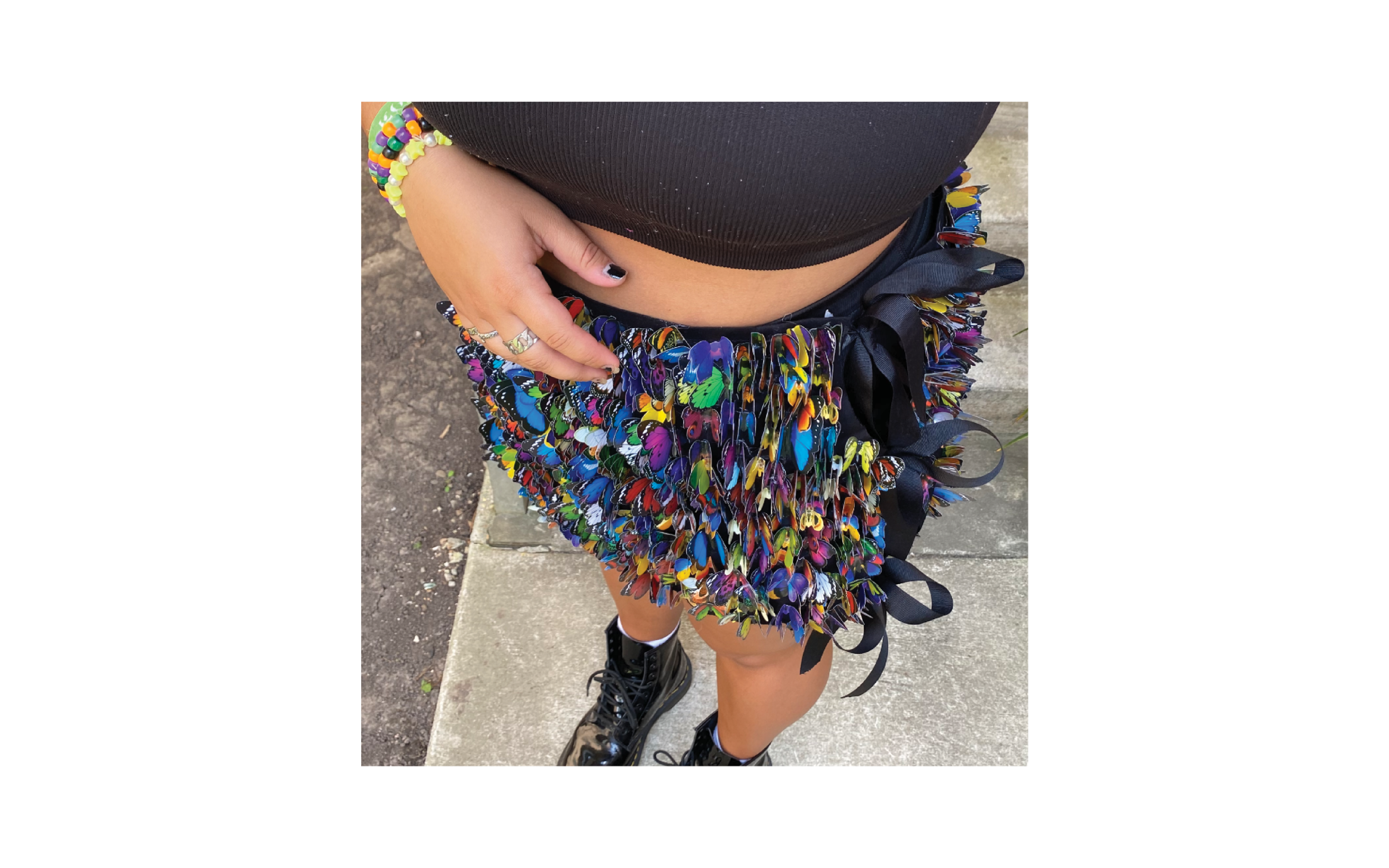 This project required over 4,000 plastic butterflies and over 30 hot glue sticks. The sides are attached by black ribbon that is meant to symbolize the body and legs of a real butterfly.